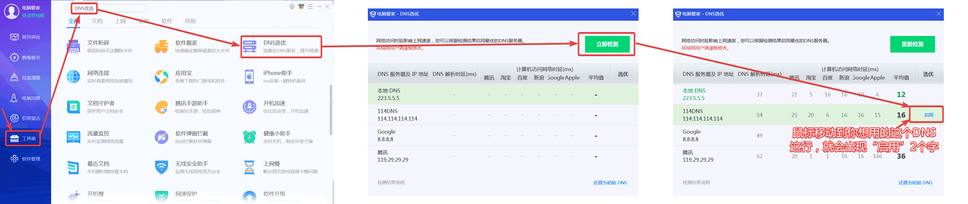 1.这里以 “软媒DNS工具”、“360安全卫士” 和 “QQ电脑管家” 这3款软件为例子进行讲解。